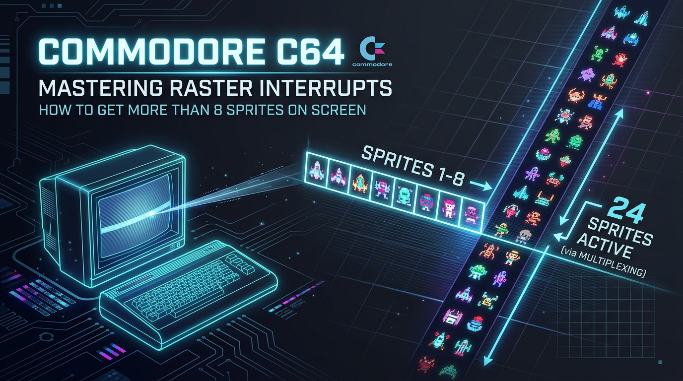 To break the limit, we use a **Raster Interrupt**. This allows us to “reprogram” a sprite’s coordinates mid-frame, effectively moving a sprite to a new location before the electron beam draws that part of the screen.